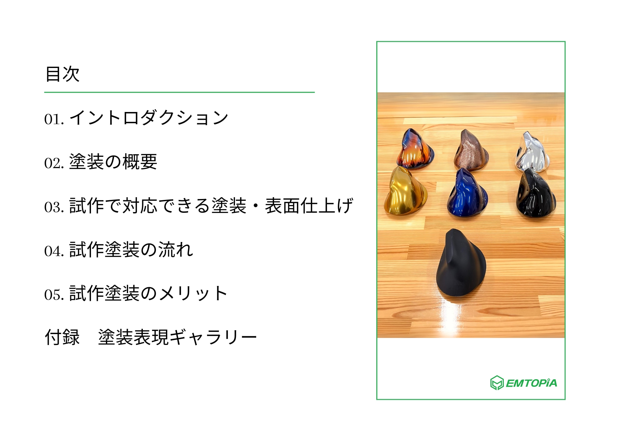 上記のポイントを中心に、塗装の基礎情報と試作での考え方をコンパクトに整理したホワイトペーパーです。 仕様検討や、関係者とのイメージ共有のための「入口資料」としてご利用いただけます。